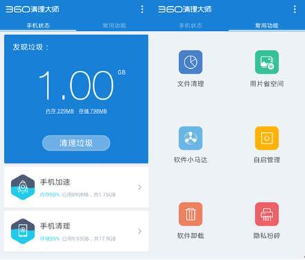 一部普通手机屏幕温度是27度左右,而开启大型游戏让手机满负荷运行时,温度可在几分钟内上升到47度,因此手机降温的关键在于让系统运行内存降低。这时,可以先使用360清理大师的清理功能,将垃圾文件一键清除,手机运行变轻快,温度自然也降下来。加速功能则能瞬间关掉后台无用软件,使被占用内存进一步释放。而后再使用自启管理,禁止不必要的软件在开机时启动,防止手机温度不断升高。
